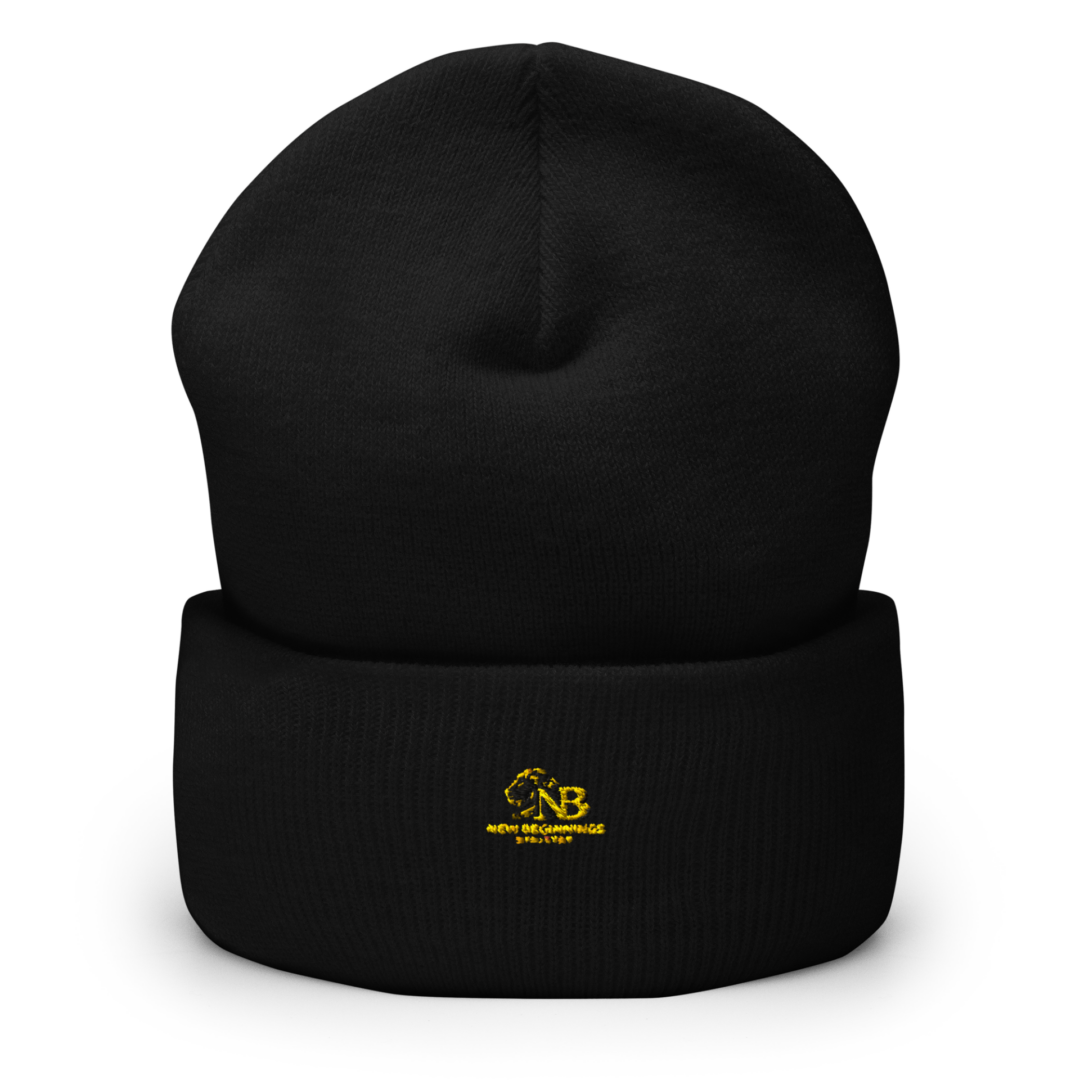 Classic black cuffed beanie featuring the embroidered New Beginnings Ministry lion logo. Designed for warmth and comfort, this beanie is a simple way to represent faith and new beginnings.